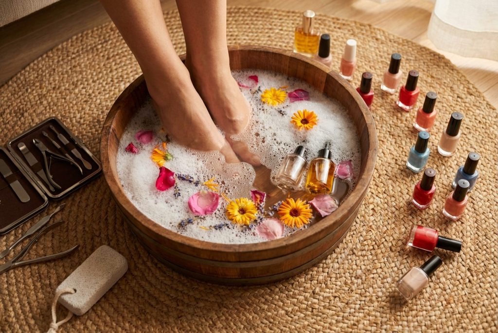 بهتر است با یک حمام آب گرم برای پاها شروع کنید. به این ترتیب میتوانید پاهای خود را تمیز و نرم کرده و آنها را برای ادامه روتین پدیکور آماده کنید. از یک لوسیون غلیظ و یک اسکراب لایهبردار خوب استفاده کنید و یک ماساژ پا را نیز در نظر بگیرید. تمام لوازم پدیکور حرفهای را میتوانید از فروشگاههای معتبر تهیه کنید.