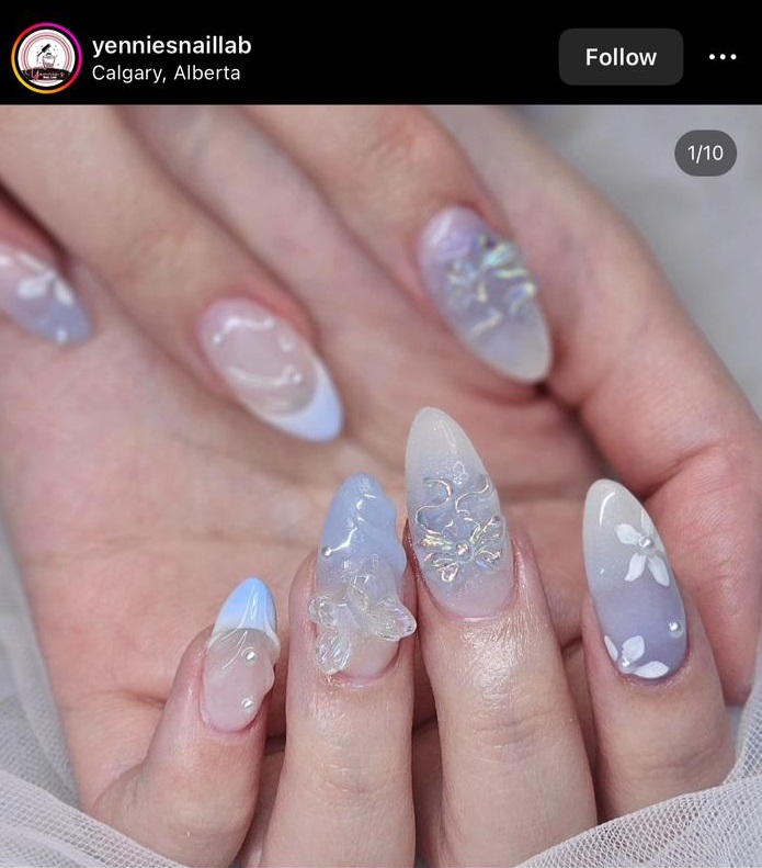 طرحی رؤیایی دیگر، طراحی گلدار با پسزمینه آبی پاستلی و سفید از yenniesnaillab است که ماهیت شکوفههای اوایل بهار را به تصویر میکشد. جزئیات ظریف سهبعدی و حالت نیمهشفاف آن، حسی لطیف و اثیری ایجاد میکند که کاملاً با حال و هوای شروع بهار هماهنگ است. رنگهای پاستلی، انتخابی بیزمان برای استقبال از فصل نو هستند.