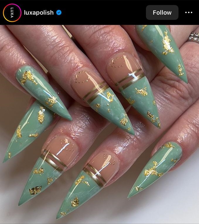 اگر به دنبال گزینهای لوکستر هستید، طرح مرمر با رنگ سبز مریمگلی و رگههای طلایی از luxapolish یک انتخاب بینظیر است. این طراحی جسورانه بر روی ناخنهای تیز استیلتو، یادآور اولین جوانههای سبز در اوایل بهار است و یک مانیکور تأثیرگذار برای ماه اسفند خلق میکند. رنگ سبز، انرژی و زندگی را به دستان شما هدیه میدهد.