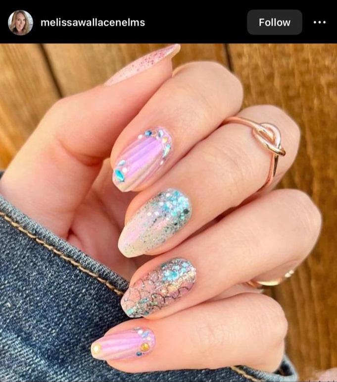 طراحی پاستلی whimsical و رؤیایی از melissawallacenelms با ترکیبی از رنگهای صورتی، آبی و اکلیلهای درخشان، یک نمونه عالی است. استفاده از نگینهای کوچک و شاین، این طراحی را برای استقبال از بهار در ماه اسفند ایدهآل کرده است. این طرح، شادی و بازیگوشی فصل جدید را به تصویر میکشد.